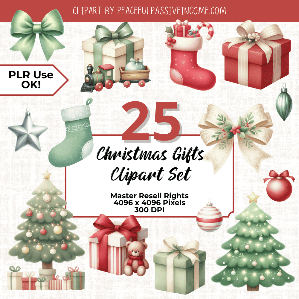 Carrie from Peaceful Passive Income has a new FREE clipart set that is perfect for any last-minute holiday products you are creating. The Christmas Gifts Clipart Set features 25 adorable trees, presents, ornaments, stockings, and bows. All in a super cute style with Master Resell Rights included!