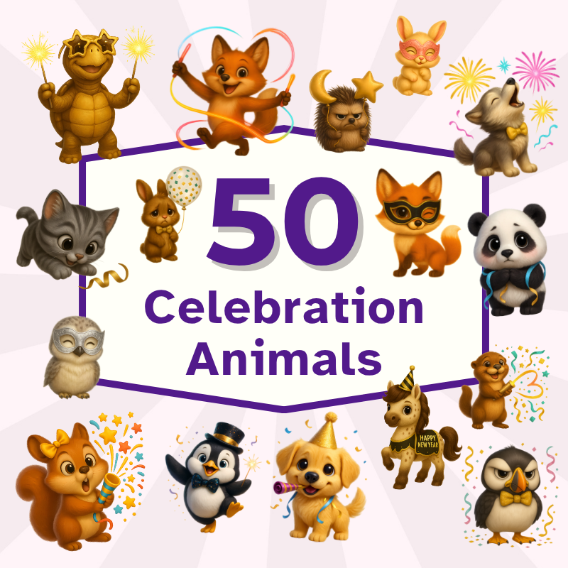 Celebration Animal Clipart + Line Art — Adorable character clipart PLUS matching line art for coloring pages, kids activities, and printable fun. ($34 value)